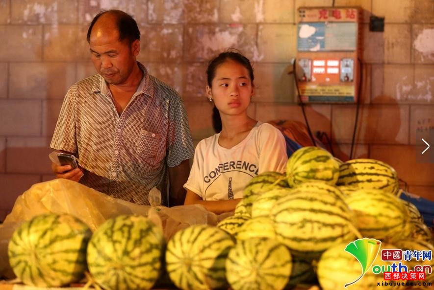 2016年7月10日夜晚,在河南省洛陽市老城街頭,宜陽縣高村鄉(xiāng)仟佰嶺村47歲的瓜農(nóng)石勛帶著12歲的女兒賣西瓜。“現(xiàn)在帶女兒賣瓜讓她體驗一下瓜農(nóng)的艱辛是為了長大女兒不再賣瓜,我家種了四畝西瓜,從家里到洛陽開拖拉機要跑六個小時,賣完西瓜回家趕,每天只能休息三個小時,女兒去最遠的地方就是洛陽城,一車西瓜賣完給女兒20塊零花錢,女兒很開心”。石勛說。