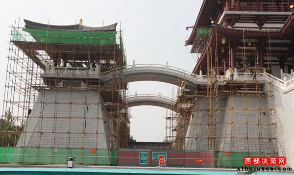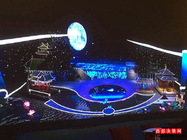 今年秋晚的舞美設(shè)計(jì)制作本著厲行節(jié)約的原則,對(duì)演播現(xiàn)場(chǎng)現(xiàn)有的實(shí)景建筑做了最大化的利用。晚會(huì)以中國(guó)目前最大的仿唐建筑群紫云樓為觀眾席背景,在廣場(chǎng)一側(cè)的人工景觀湖上搭建舞臺(tái)。舞臺(tái)主體通過(guò)一幅展開的中國(guó)傳統(tǒng)畫軸形象,將西安城墻和大明宮角樓等元素有機(jī)地結(jié)合到一起,實(shí)現(xiàn)臺(tái)在水上、水在臺(tái)中的夢(mèng)幻效果,營(yíng)造出一種穿越千年、貫通古今的浪漫。