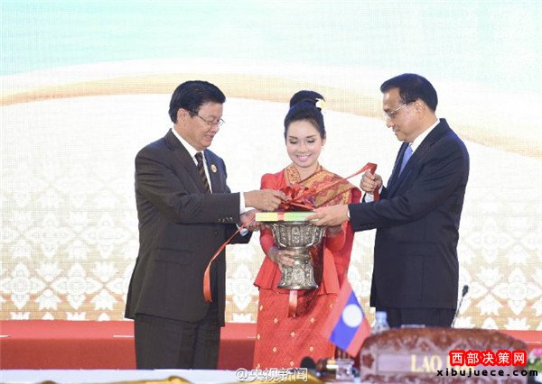 李克強(qiáng)總理7日同東盟10國領(lǐng)導(dǎo)人在老撾萬象共同出席中國—東盟建立對話關(guān)系25周年紀(jì)念儀式。觀看紀(jì)錄短片、發(fā)布對話合作事實(shí)與數(shù)據(jù)手冊后,李克強(qiáng)與東盟主席國老撾總理通倫、中國東盟關(guān)系協(xié)調(diào)國新加坡總理李顯龍?jiān)谂c會(huì)各國領(lǐng)導(dǎo)人見證下一起切蛋糕。