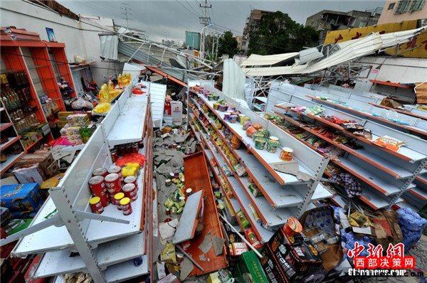 9月15日,今年第14號臺風(fēng)“莫蘭蒂”于凌晨3時(shí)05分在廈門翔安區(qū)沿海登陸,登陸時(shí)中心附近最大風(fēng)力15級(48米/秒,強(qiáng)臺風(fēng)級),中心氣壓945百帕,給翔安當(dāng)?shù)貛韲?yán)重?fù)p失。圖為翔安一超市被摧毀。