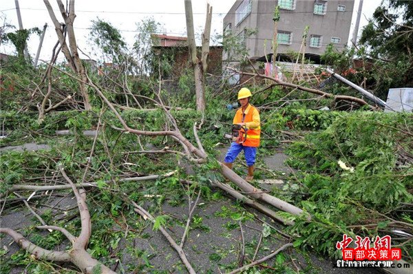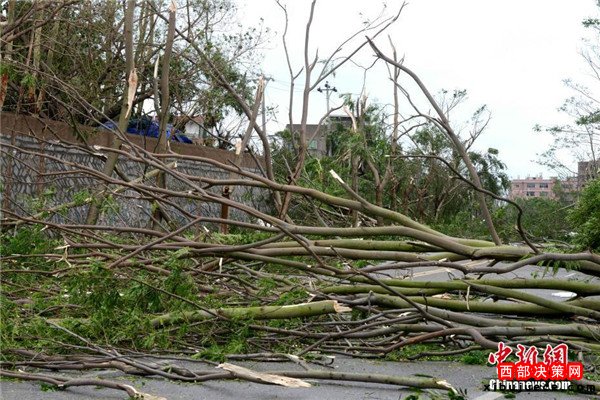 登陸點(diǎn)大量行道樹被風(fēng)吹倒。