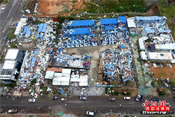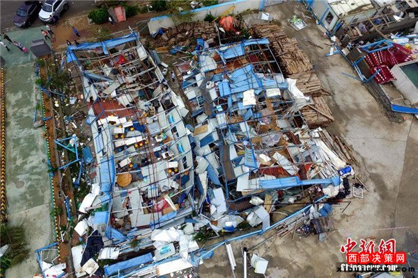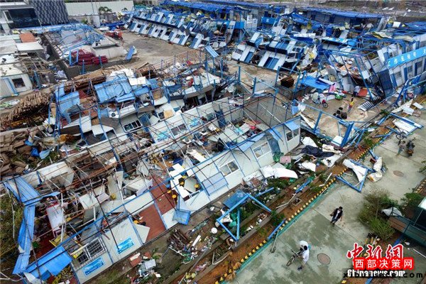 9月15日,今年第14號臺風(fēng)“莫蘭蒂”于凌晨3時(shí)05分在廈門翔安沿海登陸,登陸時(shí)中心附近最大風(fēng)力15級(48米/秒,強(qiáng)臺風(fēng)級),中心氣壓945百帕。圖為航拍登陸點(diǎn)翔安一工地工棚被完全摧毀。