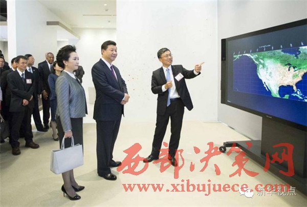 2015年9月23日,習(xí)近平參觀美國(guó)微軟公司總部。這是習(xí)近平夫婦觀摩大數(shù)據(jù)可視化系統(tǒng)展示。新華社記者蘭紅光攝