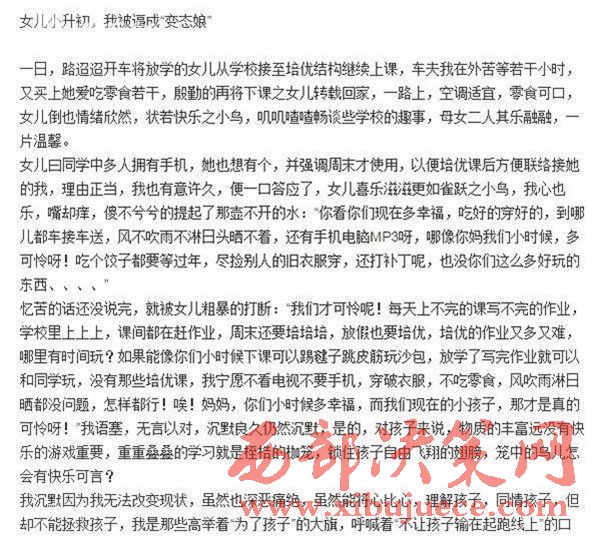 家長如此不辭辛勞,背后卻也有著道不盡的苦水。武漢一位媽媽就發(fā)出了名為《女兒小升初,我被逼成"變態(tài)娘"》的帖子,講訴自己節(jié)衣縮食,卻給孩子花很多錢報各種培訓(xùn)班,控訴"變態(tài)的培優(yōu)市場"和不公平的升學(xué)門檻,引來許多家長共鳴。