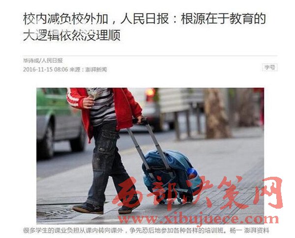 那么到底該從何思考這場學(xué)而思的瘋狂?11月15日出版的《人民日報》表示,校內(nèi)減負校外加的現(xiàn)象根源在于,教育的大邏輯依然沒有理順。文章說,如果不能將招錄制度的改革做足做透,不能將教育資源均衡化的工作咬定不放松,那么校內(nèi)減負校外加的怪現(xiàn)狀,就會變著花樣地持續(xù)上演。