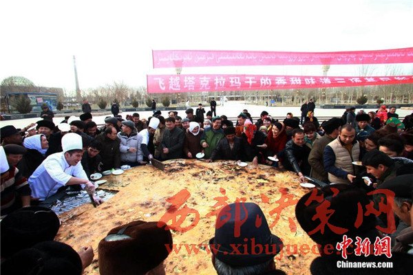 據(jù)悉,庫麥其是維吾爾族傳統(tǒng)美食,又稱且末“大披薩”,用300公斤面粉、200公斤羊肉、60公斤洋蔥,花費(fèi)4個(gè)半小時(shí)制成,直徑達(dá)3.65米,寓意一年365天,天天有肉馕吃。圖為廚師忙著為游客切“最大的庫麥其”。
