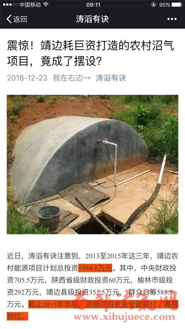雖然靖邊縣審計局的審計報告,語言高度凝練,也沒給出相應(yīng)的案例和圖片證明,但很顯然,近三年以來,靖邊縣能源辦手持巨額撥款,全力推進的農(nóng)村沼氣工程,在今年春天就變成了“利用率低、廢棄率高”的擺設(shè)。如果是這樣的話,投入再多的財力人力,又有什么意義呢?