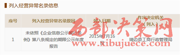 靖邊興發(fā)公司2015年7月16被工商部門列入經(jīng)營異常名錄