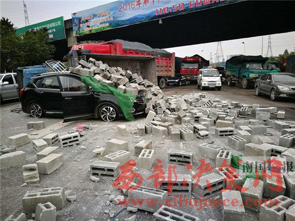 12月24日中午,在柳州市柳長(zhǎng)路北外環(huán)立交橋底,一輛寶駿越野車準(zhǔn)備掉頭時(shí),后方一輛運(yùn)磚車剎不住導(dǎo)致翻車,一堆磚頭把這輛寶駿車埋了。