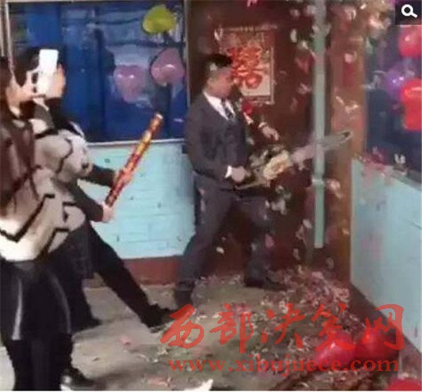 伴娘擋在門前,向新郎要紅包,一定要數目夠大才肯開門?,F場的伴郎團把伴娘拉下去,新郎撿起了地上的一把電鋸,這是要干什么呢?