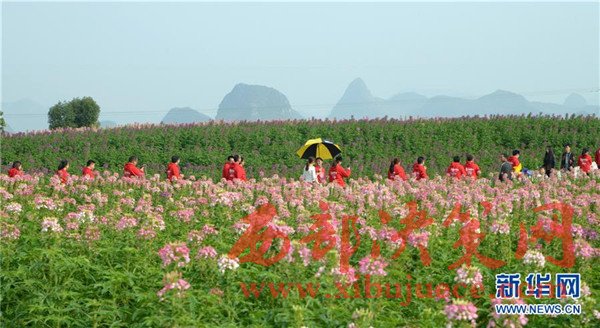 1月31日,游客在廣西來(lái)賓市忻城縣的花海中游玩。