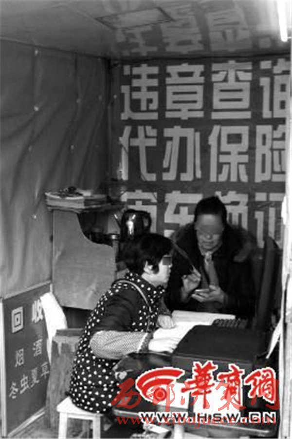 昨日上午9時許,華商報記者在這家門店外面看到,門口除了一個“代辦保險 違章查詢 復(fù)印”的廣告牌之外,還有“高價回收,金銀加工回收”的牌子。門店里有個電腦,一名女子在電腦前不斷地查詢著違法信息。