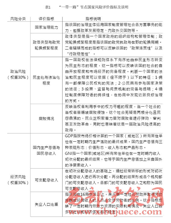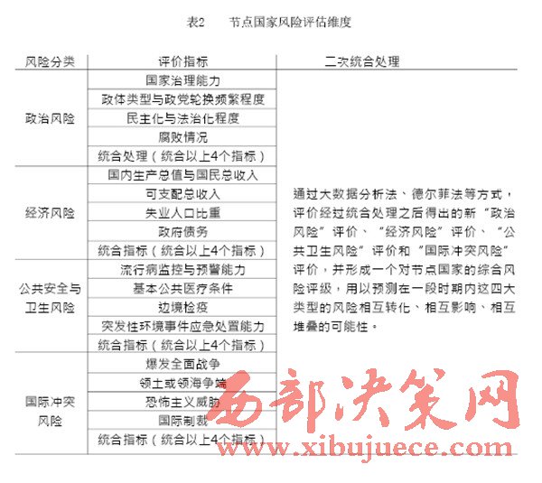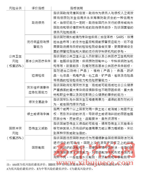 “一帶一路”建設中重要國家的治理風險是我們的主要關注對象,在借助國內外智庫和科研院所已完成的眾多研究成果的基礎上,建立一套對節(jié)點國家風險的評級體系,如表1(見P28)所示。節(jié)點國家風險評價指標中,政治風險與經濟風險的評價參考經濟學人智庫的國家風險模型(EIU country risk model);公共衛(wèi)生風險的評價參考中國衛(wèi)生與經濟社會發(fā)展統(tǒng)計數據庫對公共衛(wèi)生的指標設計;國際沖突風險評價根據經濟學人智庫發(fā)布的白皮書《愿景與挑戰(zhàn)——“一帶一路”沿線國家風險評估》與中國出口信用保險公司發(fā)布的2015年版《國家風險分析報告》和《全球風險地圖》綜合考量得出。具體而言,我們可以從“政治風險”“經濟風險”“公共衛(wèi)生風險”和“國際沖突風險”四個維度來評估選擇出的節(jié)點國家的風險,如表2(見P30)所示。