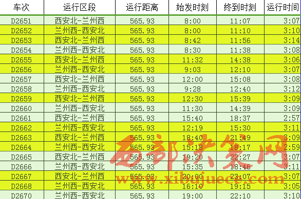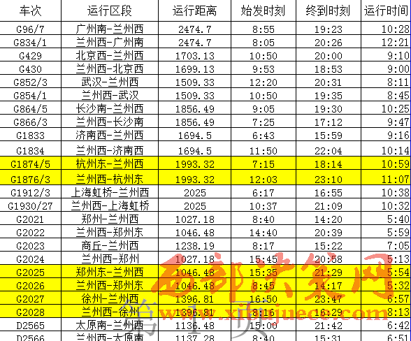 從寶蘭高鐵列車(chē)開(kāi)行方案來(lái)看,蘭州西至北京西開(kāi)行動(dòng)車(chē)組列車(chē)1對(duì),為列車(chē)雙向?qū)﹂_(kāi),共計(jì)運(yùn)行1699公里,9:53從蘭州西站始發(fā),18:53達(dá)到北京西站,車(chē)次為 G430次,運(yùn)行時(shí)間9小時(shí)整;10:50從北京西站始發(fā),20:00到達(dá)蘭州西站,車(chē)次為 G429次。蘭州西至廣州南開(kāi)行動(dòng)車(chē)組列車(chē)1對(duì),為列車(chē)雙向?qū)﹂_(kāi),共計(jì)運(yùn)行2474.7公里,8:05從蘭州西站始發(fā),20:26到達(dá)廣州南站,車(chē)次為 G834/1次;8:55從廣州南站始發(fā),19:23到達(dá)蘭州西站,車(chē)次為 G96/7次,運(yùn)行時(shí)間10小時(shí)28分。蘭州西至上海虹橋站開(kāi)行動(dòng)車(chē)組列車(chē)1對(duì),為列車(chē)雙向?qū)﹂_(kāi),共計(jì)運(yùn)行2025公里,10:37從蘭州西站始發(fā),21:09到達(dá)上海虹橋站,車(chē)次為 G1930/27次,運(yùn)行時(shí)間10小時(shí)32分;6:17從上海虹橋站始發(fā),16:55到達(dá)蘭州西站,車(chē)次為 G1912/3次。