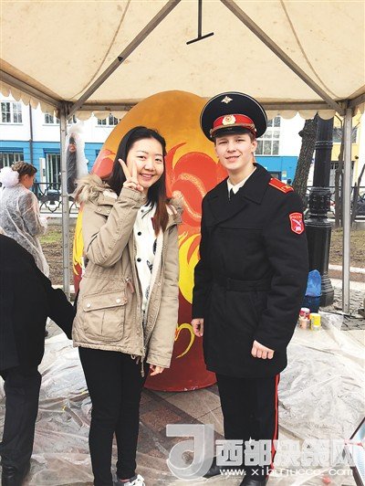 在俄羅斯的節(jié)日慶典活動中,姜若晨(左一)與當(dāng)?shù)剀娦W(xué)生的合影。