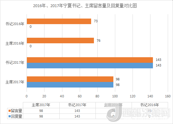 據(jù)統(tǒng)計(jì),2017年,人民網(wǎng)網(wǎng)友分別給寧夏黨委書(shū)記、政府主席公開(kāi)留言143條和98條,同期增長(zhǎng)幅度較大,其中書(shū)記留言量增長(zhǎng)49%。值得點(diǎn)贊的是,書(shū)記、主席全年的回復(fù)率達(dá)100%,各項(xiàng)數(shù)據(jù)均創(chuàng)新高。