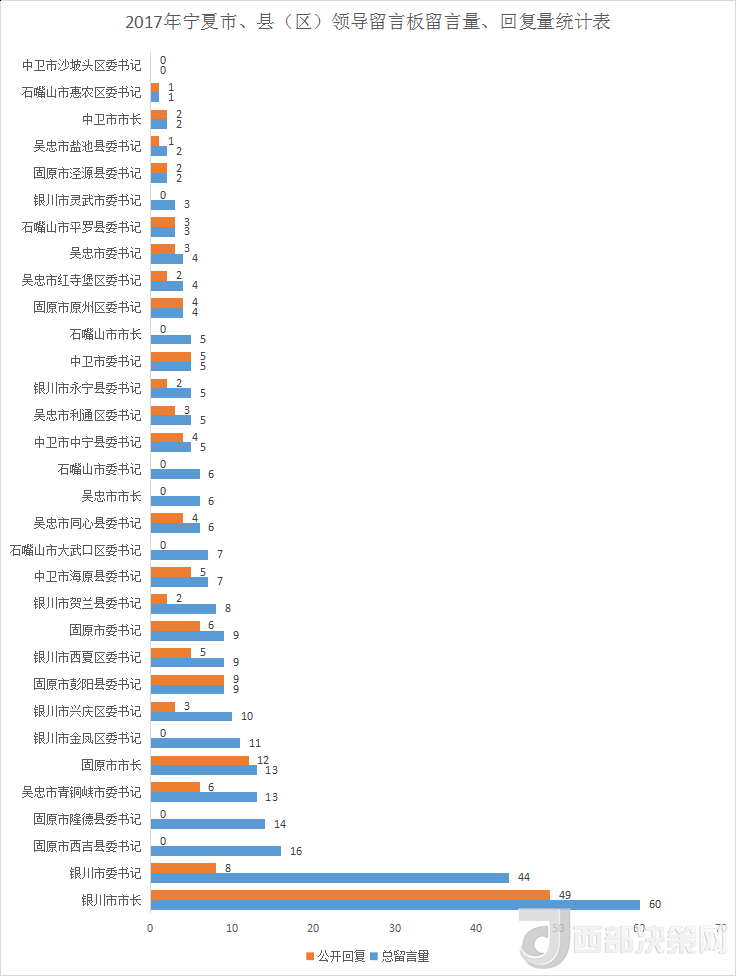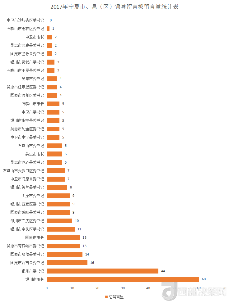 銀川市市長(zhǎng)、銀川市委書(shū)記、固原市西吉縣委書(shū)記的留言量分別以60、44、16條進(jìn)入前三名。盡管網(wǎng)民給固原市西吉縣委書(shū)記的留言量進(jìn)前三,但回復(fù)量卻為0。