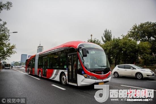 2017年10月22日,北京,首批以“中國紅”為外觀主題的18米純電動公交車投入運營。圖片來源:視覺中國
