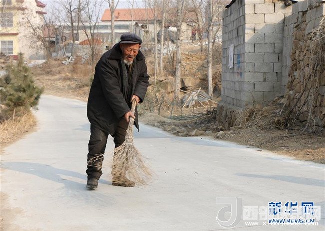 2月7日,山東省臨沂市蒙陰縣高都鎮(zhèn)高都村黑石溝村83歲的村民薛慶成在清掃自家門口的公路。