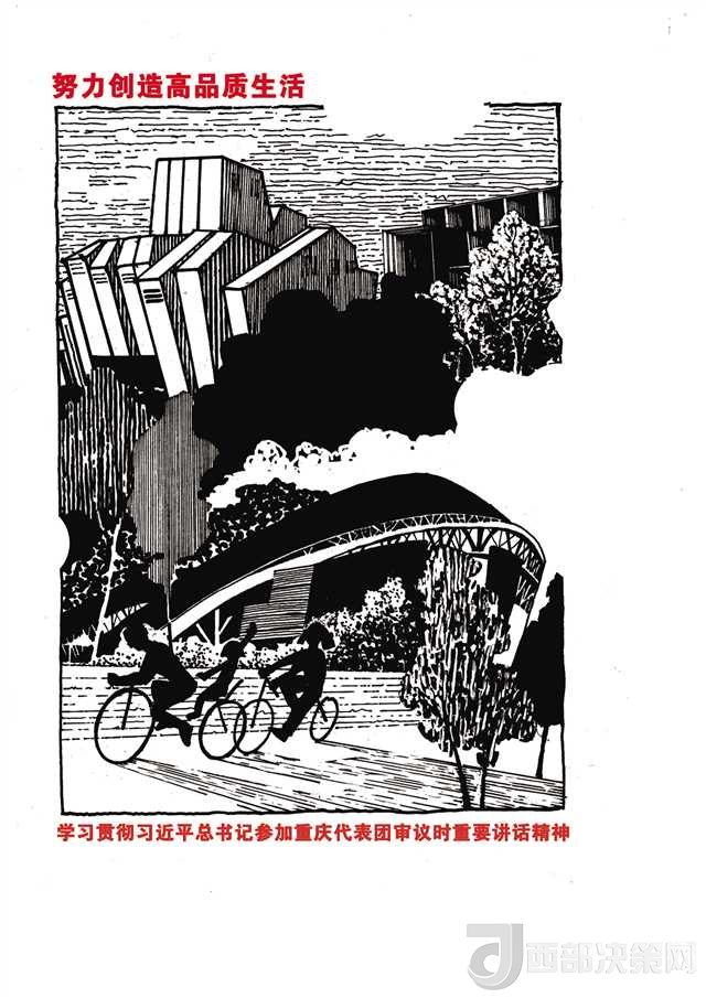 另一組負(fù)責(zé)“創(chuàng)造高品質(zhì)生活”的師生也遭遇類似的問(wèn)題。最初師生們想用一組市民在公園鍛煉的場(chǎng)景來(lái)闡述這個(gè)主題,但很快就發(fā)現(xiàn)這樣的畫面太簡(jiǎn)單蒼白。最終,他們將重慶大劇院、重慶美術(shù)館、奧體中心等重慶的標(biāo)志性建筑作為文化符號(hào)列入畫稿中,才有了令人耳目一新的感覺(jué)。