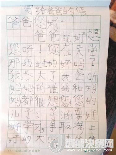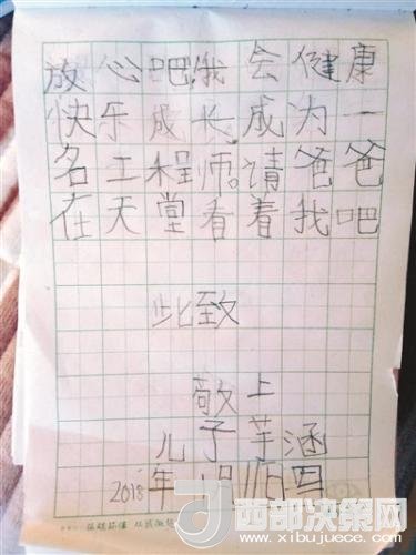 “爸爸您好。爸爸我好想您呀!您在天堂那邊過的好嗎?我長大了,我會聽媽媽的話。我和媽媽都想您。您的兒子芋涵要好好學(xué)習(xí),爭取考上好的大學(xué)。請爸爸放心吧。我會健康快樂成長為一名工程師。請爸爸在天堂看著我吧。此致,敬上。兒子芋涵。2018年1月11日寫。”