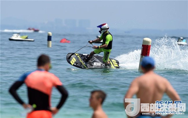 在三亞蜈支洲島參加2016動(dòng)力沖浪板國際賽中國站的選手在比賽中(2016年9月17日攝)。新華社記者 楊冠宇 攝