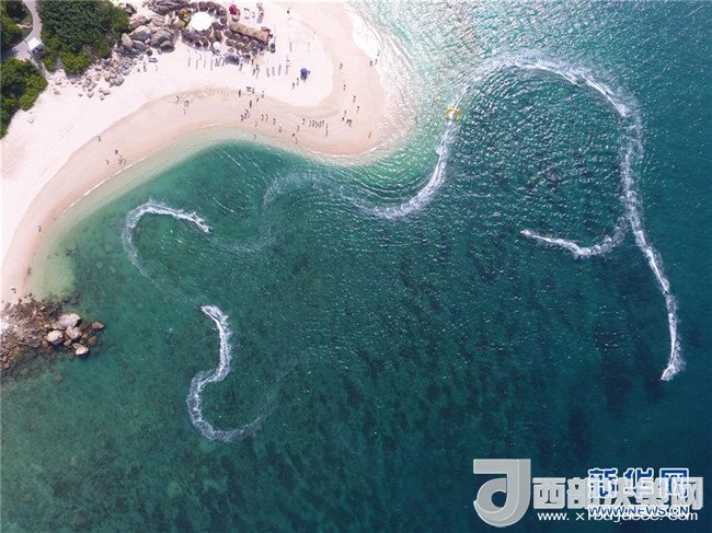 在三亞蜈支洲島參加2016動(dòng)力沖浪板國際賽中國站的選手在比賽中(2016年9月18日無人機(jī)拍攝)。新華社記者 楊冠宇 攝