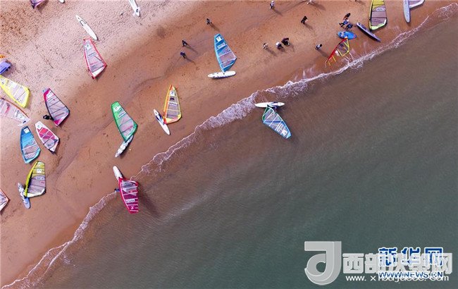 參加2017第四屆國際旅游島帆板大獎(jiǎng)賽??诖螵?jiǎng)賽的選手在比賽結(jié)束后上岸(2017年11月16日無人機(jī)拍攝)。新華社記者 楊冠宇 攝