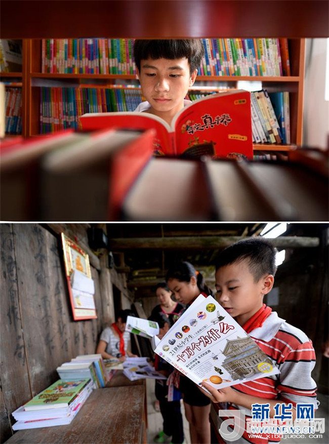 這是一張拼版圖片。上圖為2018年5月30日,在廣西三江侗族自治縣洋溪鄉(xiāng)中學,15歲的秦仁金在圖書館里看書;下圖為2014年6月10日,秦仁金在吊腳樓教室閱讀愛心人士送來的書本。