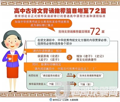 其中,語文課標最突出,中華優(yōu)秀傳統(tǒng)文化方面的內(nèi)容貫穿必修、選擇性必修和選修各個部分。一是內(nèi)容更全,在“課內(nèi)外讀物建議”部分,除保留原有《論語》《孟子》《莊子》外,增加了《老子》《史記》等文化經(jīng)典著作,要求學生廣泛閱讀各類古詩文,覆蓋先秦到清末各個時期。二是分量更多,課程標準明確規(guī)定“課內(nèi)閱讀篇目中,中國古代優(yōu)秀作品應(yīng)占1/2”。三是要求更高,在全面加強的同時,還設(shè)置中華優(yōu)秀傳統(tǒng)文化學習專題,進行中華傳統(tǒng)文化經(jīng)典作品深入學習研討。將原標準“誦讀篇目的建議”改為“古詩文背誦推薦篇目”,推薦篇目數(shù)量也從14篇(首)增加到72篇(首),提高了學習要求。