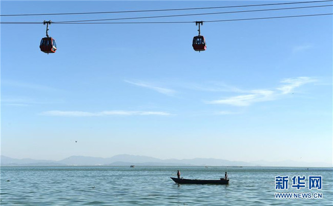 下方是工作人員在滇池上準備打撈垃圾和雜物,上方是游客乘坐纜車在觀賞滇池景色(2017年11月14日攝)。云南省昆明市滇池流域自2008年以來實行河長制,河道生態(tài)環(huán)境和水質得到明顯改善。
