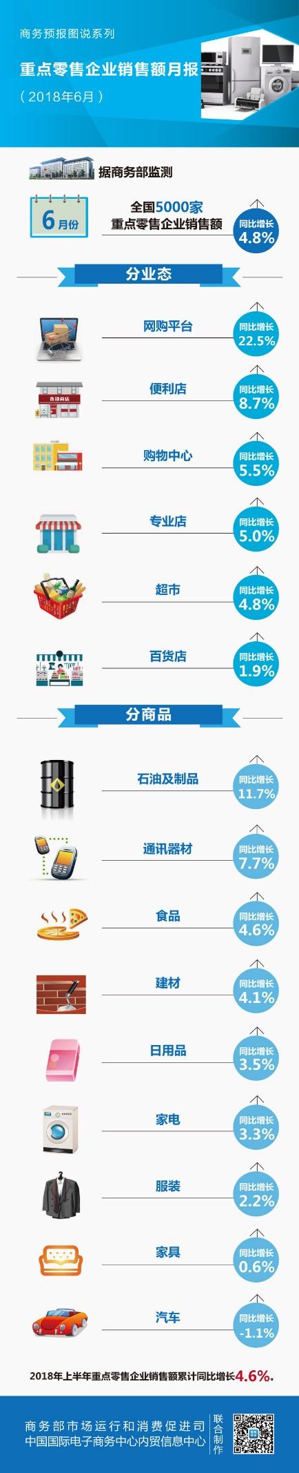 據(jù)商務(wù)部監(jiān)測(cè),2018年6月,全國(guó)5000家重點(diǎn)零售企業(yè)銷(xiāo)售額同比增長(zhǎng)4.8%。上半年重點(diǎn)零售企業(yè)銷(xiāo)售額累計(jì)同比增長(zhǎng)4.6%。