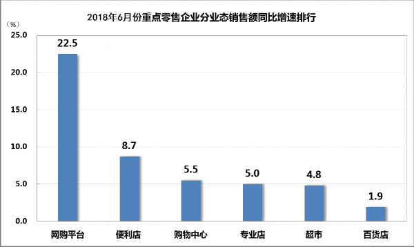 網(wǎng)購(gòu)平臺(tái)銷(xiāo)售額同比增長(zhǎng)22.5%,便利店、購(gòu)物中心、專(zhuān)業(yè)店銷(xiāo)售額同比分別增長(zhǎng)8.7%、5.5%、5.0%,超市、百貨店銷(xiāo)售額同比分別增長(zhǎng)4.8%和1.9%。