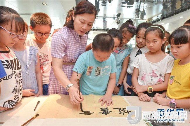 7月24日,在福建省少年兒童圖書館,省級書法名師、福州市烏山小學校長方曉敏在指導小營員們習字。