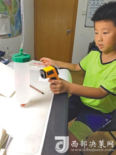首先設(shè)計(jì)一個(gè)裝置,下部寬大的容器盛水,上部細(xì)長(zhǎng)的管子可以觀察水的體積變化。然后將裝滿水的容器放入冰箱冷凍層,形成冰水混合物,此時(shí)水溫接近零攝氏度。最后將容器取出,用手持式測(cè)溫儀測(cè)量水溫……這一系列步驟,不是實(shí)驗(yàn)室里進(jìn)行的專業(yè)研究,而是南京師范大學(xué)附屬小學(xué)四年級(jí)學(xué)生徐子越和王美澄正在做的暑假作業(yè),他們通過(guò)觀察水的體積隨溫度的變化,來(lái)解釋冰為什么會(huì)浮在水面上。