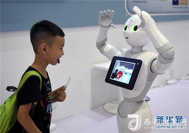 一名小朋友在2018世界機(jī)器人大會(huì)上與機(jī)器人進(jìn)行互動(dòng)(8月16日攝)。 新華社記者 羅曉光 攝