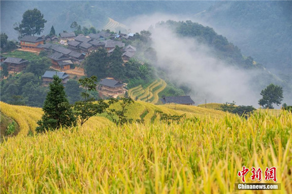 遠(yuǎn)眺貴州省榕江縣陽開梯田秋色,金黃的水稻與苗寨相映成趣。 中新社記者 賀俊怡 攝