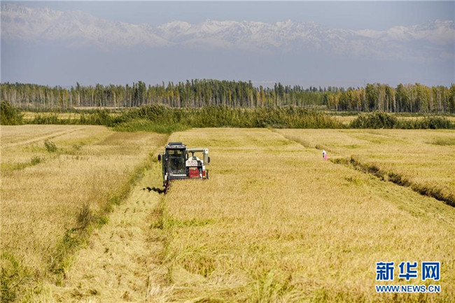 9月26日,收割機在新疆察布查爾錫伯自治縣種羊場的一處稻田收割水稻。眼下,地處新疆伊犁河谷的察布查爾錫伯自治縣約20萬畝水稻迎來收割季。當?shù)剞r民搶抓農時,忙碌在金色田園中。記者 胡虎虎 攝