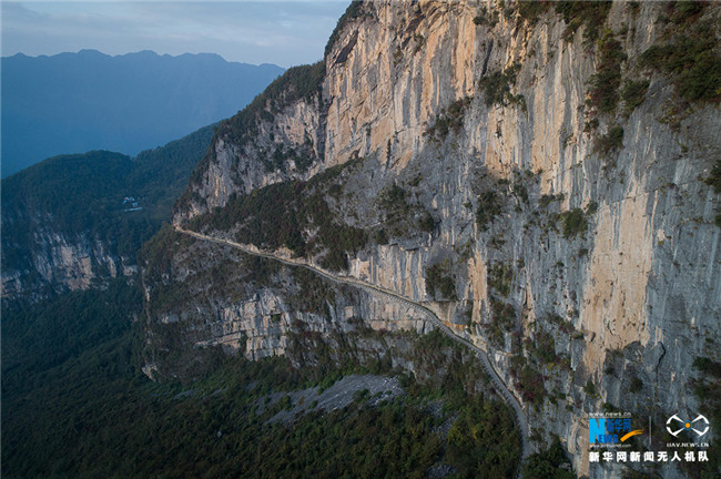 稱(chēng)其“懸崖天路”,來(lái)源于其險(xiǎn)要的地勢(shì)——上方是巖石,外側(cè)是懸崖峭壁。由于地處海拔1500米的高山,常有云霧繚繞,驚險(xiǎn)萬(wàn)分。新華網(wǎng) 李相博 攝