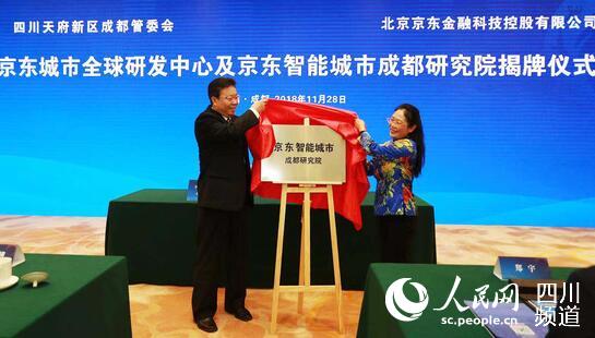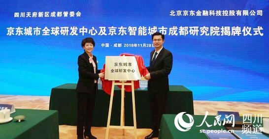 成都市副市長劉筱柳和京東集團(tuán)副總裁、京東數(shù)字科技首席數(shù)據(jù)科學(xué)家、京東智能城市研究院院長鄭宇教授共同為京東城市全球研發(fā)中心揭牌(圖片由主辦方提供)
