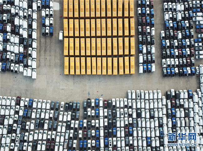 大批國(guó)產(chǎn)車(chē)輛在江蘇連云港港口碼頭等待裝船(2018年12月31日無(wú)人機(jī)拍攝)。新華社發(fā)(耿玉和 攝)