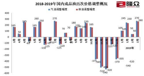2018-2019年國(guó)內(nèi)成品油歷次價(jià)格調(diào)整概況。來(lái)源:隆眾資訊