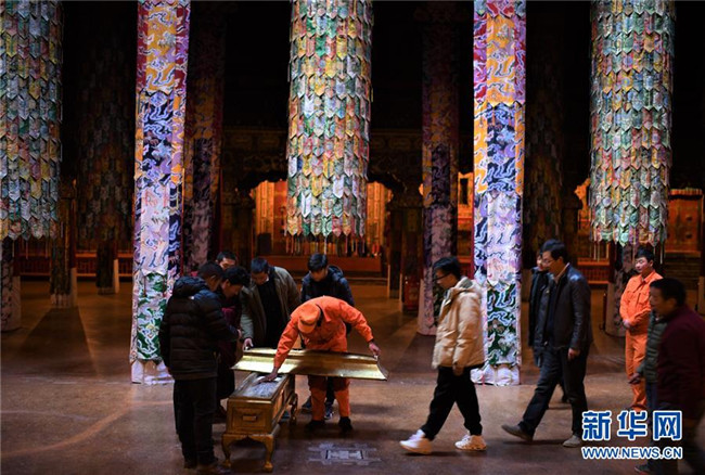 布達(dá)拉宮管理處的工作人員對佛像進(jìn)行數(shù)字化存檔(2018年11月16日攝)。 新華社記者 普布扎西 攝