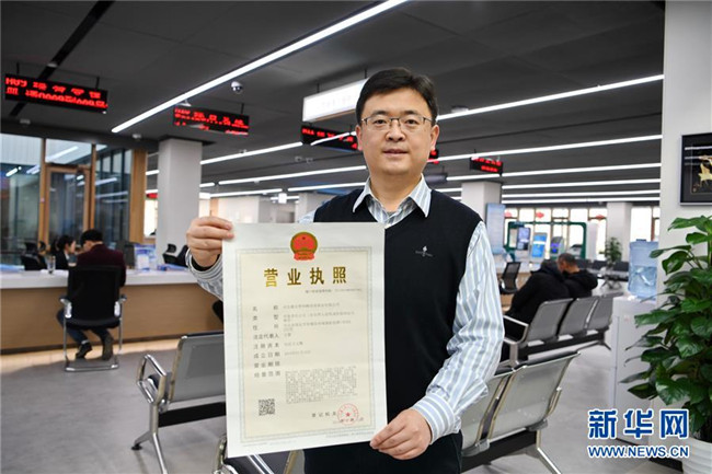 一家入駐雄安新區(qū)的企業(yè)工作人員在市民服務(wù)中心內(nèi)展示辦理的營業(yè)執(zhí)照(1月17日攝)。新華社記者 牟宇 攝