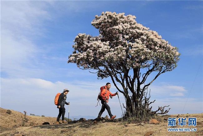 4月23日,戶外愛(ài)好者經(jīng)過(guò)龍頭山野生杜鵑花。 近日,四川省攀枝花市鹽邊縣龍頭山十余萬(wàn)畝野生杜鵑花盛開(kāi),吸引省內(nèi)外游客前來(lái)登山賞花。 龍頭山位于四川省攀枝花市鹽邊縣北部的紅寶苗族彝族鄉(xiāng)境內(nèi),這里的野生杜鵑花花期為2月至5月。 新華社記者 江宏景 攝