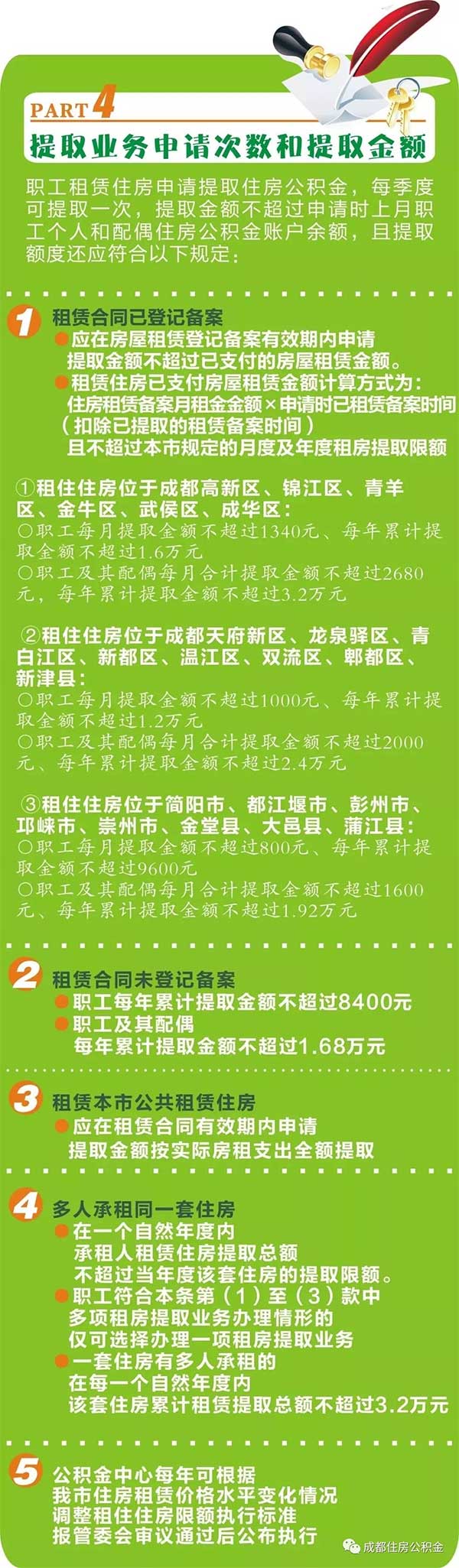 新修訂的《成都住房公積金提取管理辦法》在租房提取方面有哪些變化?申請租房提取的條件是什么?租房提取可提取的額度是多少?今日,成都住房公積金管理中心對相關(guān)問題進行了梳理解答。