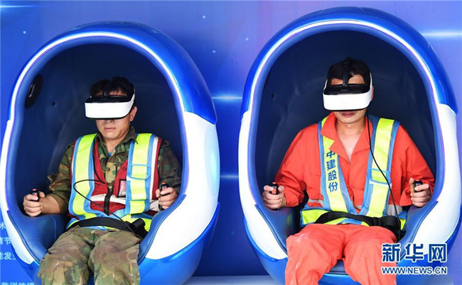 6月5日,重慶化龍橋超高層項(xiàng)目工人在VR安全體驗(yàn)館內(nèi)體驗(yàn)“高空墜落”。在VR安全體驗(yàn)館,工人們可通過VR游戲的方式親身體驗(yàn)高空墜落、消防事故處置等項(xiàng)目,了解施工過程中可能遇到的危險(xiǎn)、困難以及解決方法。 新華社記者 王全超 攝