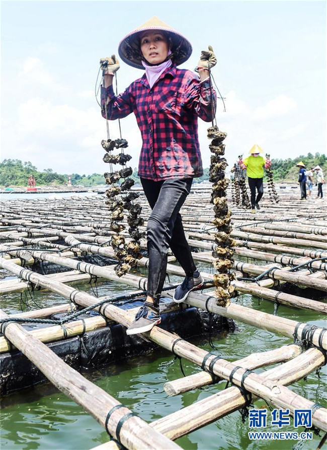 在欽州市龍門港連片萬畝大蠔養(yǎng)殖基地,村民在收取養(yǎng)殖的大蠔(7月20日攝)。新華社記者 張愛林 攝