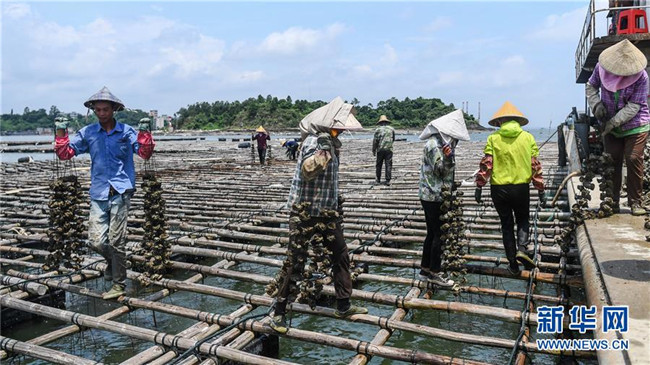 村民在蠔排上提取蠔柱收獲大蠔(7月20日攝)。 新華社記者 張愛林 攝