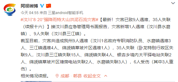 據(jù)阿壩州委外宣辦官方微博消息,接汶川縣應急管理局書面報告,災害新增1人遇難(汶川縣水磨鎮(zhèn))、9人失聯(lián)(汶川縣三江鎮(zhèn))。